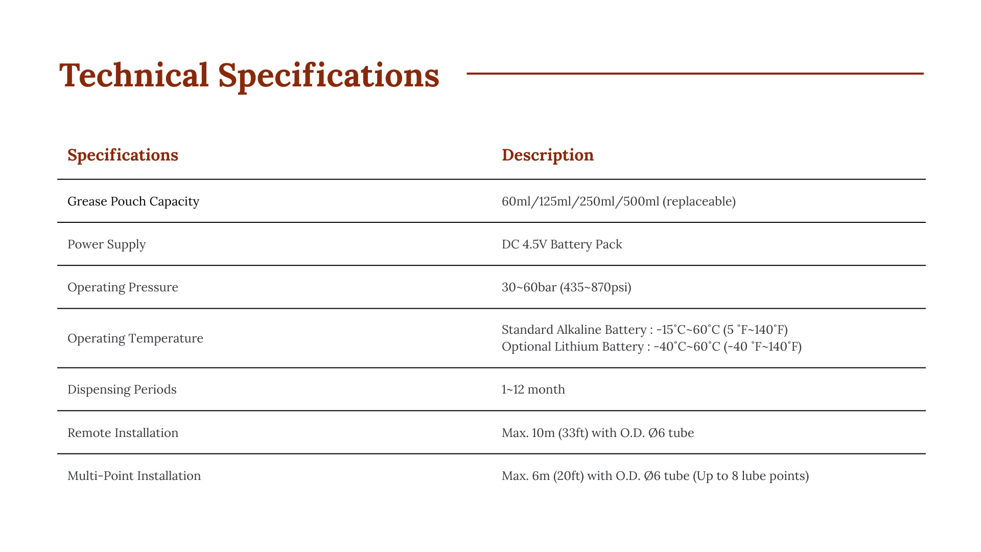 Built for heavy-duty performance, the Technolube M operates at pressures up to 30–60 bar (435–870 psi) and supports both single and multi-point lubrication — making it ideal for conveyors, motors, and other equipment where consistent, accurate lubrication is critical.