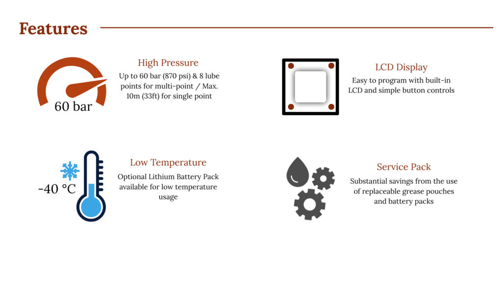The Technolube M is an advanced, electromechanical lubrication system designed to provide reliable and precise grease delivery in demanding industrial environments. Engineered to outperform traditional gas-type lubricators, it features a vertical self-priming pump, smart microprocessor control, and an easy-to-use LCD display.