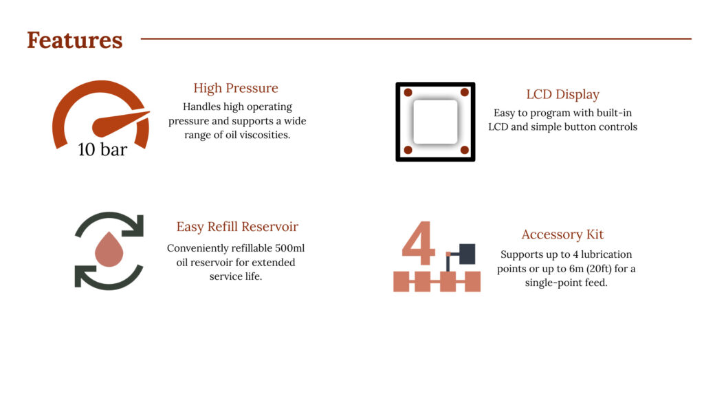 Equipped with a 500ml oil reservoir and battery pack, the OL500 can precisely dispense very small amounts of lubricant at selectable intervals. Output volume is fully adjustable from 0.70ml to 33.4ml per day, allowing a service period ranging from half a month up to 24 months per reservoir. For systems requiring multiple lubrication points, the OL500 can be configured with up to 4 feeds using optional installation kits.